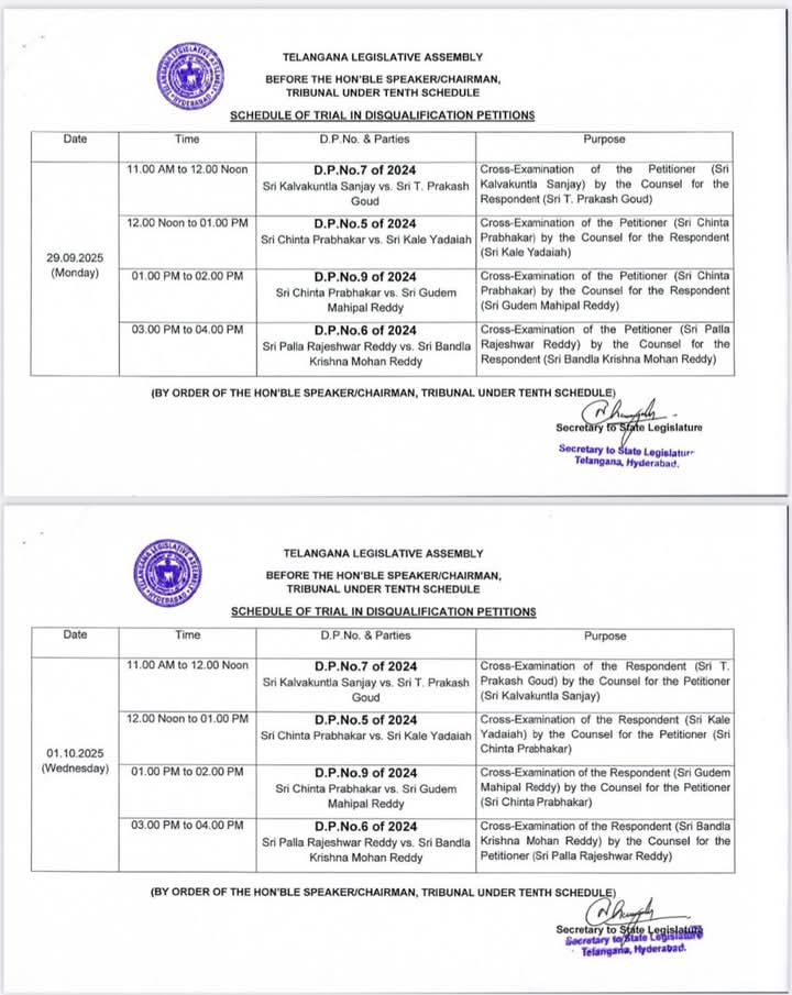పార్టీ ఫిరాయింపు ఎమ్మెల్యేలను ఈనెల 29 న ప్రత్యక్ష విచారణకు విచారణకు హాజరు కావాలని పార్టీ ఫిరాయించిన నలుగురు ఎమ్మెల్యేలకు స్పీకర్ గడ్డం ప్రసాద్ కుమార్ నోటీసులు జారీ చేసారు. ఎమ్మెల్యేలు కాలే యాదయ్య, గూడెం మహిపాల్ రెడ్డి, ప్రకాష్ గౌడ్, బండ్ల కృష్ణమోహన్ రెడ్డిలకు నోటీసులు జారీ చేసారు. బీఆర్ఎస్ తరుపున ఫిర్యాదు చేసిన ఎమ్మెల్యేలు చింత ప్రభాకర్, కల్వకుంట్ల సంజయ్, పల్లా రాజేశ్వర్ రెడ్డికి నోటీసులు. బీఆర్ఎస్ పిటిషనర్లను క్రాస్ ఎగ్జామినేషన్ చేయనున్న ఫిరాయింపు ఎమ్మెల్యేల న్యాయవాదులు. అక్టోబర్ 1 న మరోసారి పార్టీ ఫిరాయింపు ఎమ్మెల్యేలను క్రాస్ ఎగ్జామినేషన్ చేయనున్న పిటిషనర్ తరుపు న్యాయవాదులు.