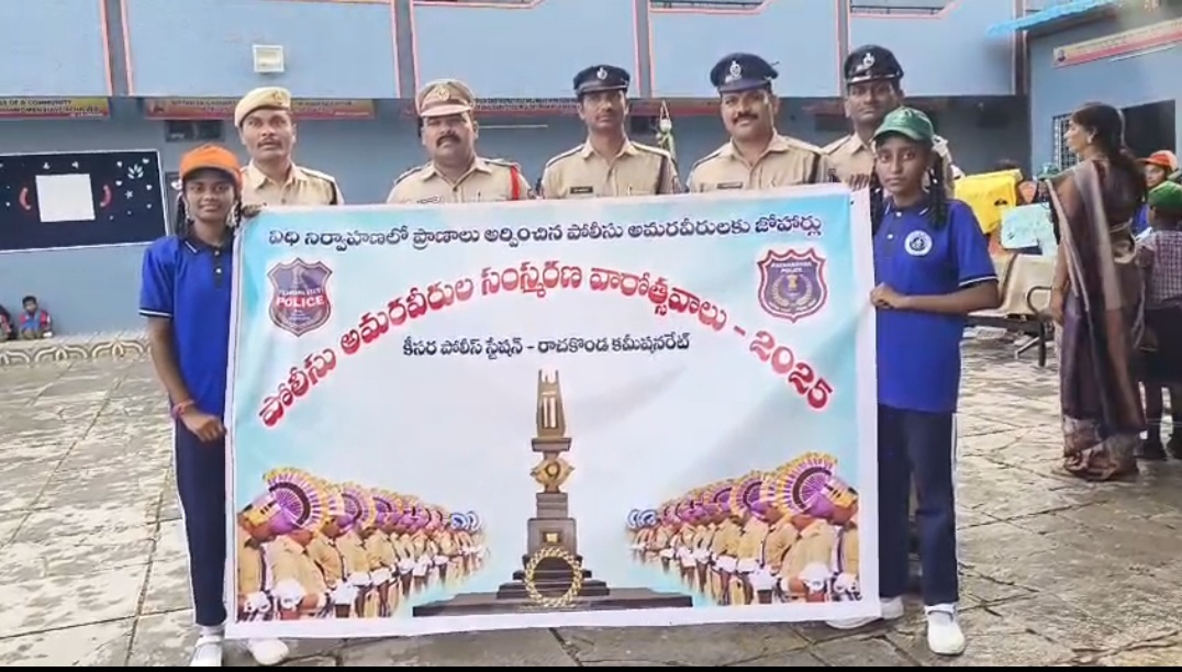 మహానది, మేడ్చల్: మేడ్చల్ జిల్లా కీసర పోలీస్ స్టేషన్ పరిధిలోని అరుంధతి విద్యాలయ పాఠశాలలో పోలీస్ అమరవీరుల సంస్మరణ వారోత్సవాలు ఘనంగా నిర్వహించారు. స్కూల్ విద్యార్థులతో పాటు కీసర పోలీస్ సిబ్బంది సైకిల్ ర్యాలీలో పాల్గొన్నారు. కీసర ప్రధాన చౌరస్తా లో తెలంగాణ స్తూపం వద్ద స్కూల్ విద్యార్థులతో క్యాండిల్ తో పోలీస్ అమరవీరులకు ఘన నివాళులు అర్పించారు. ఈ కార్యక్రమంలో పోలీస్ సిబ్బంది, స్కూల్ టీచర్స్ విద్యార్థులు పాల్గొన్నారు.